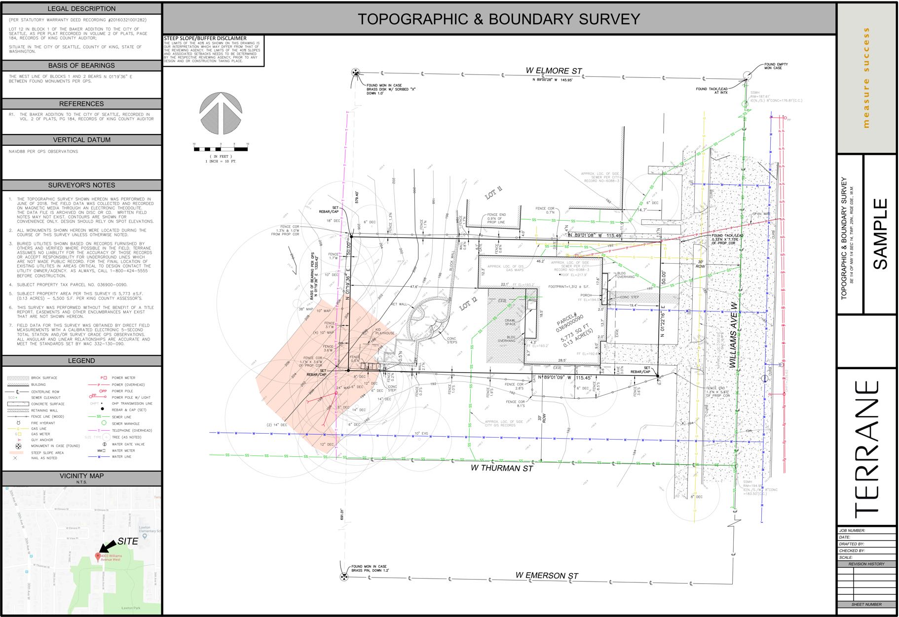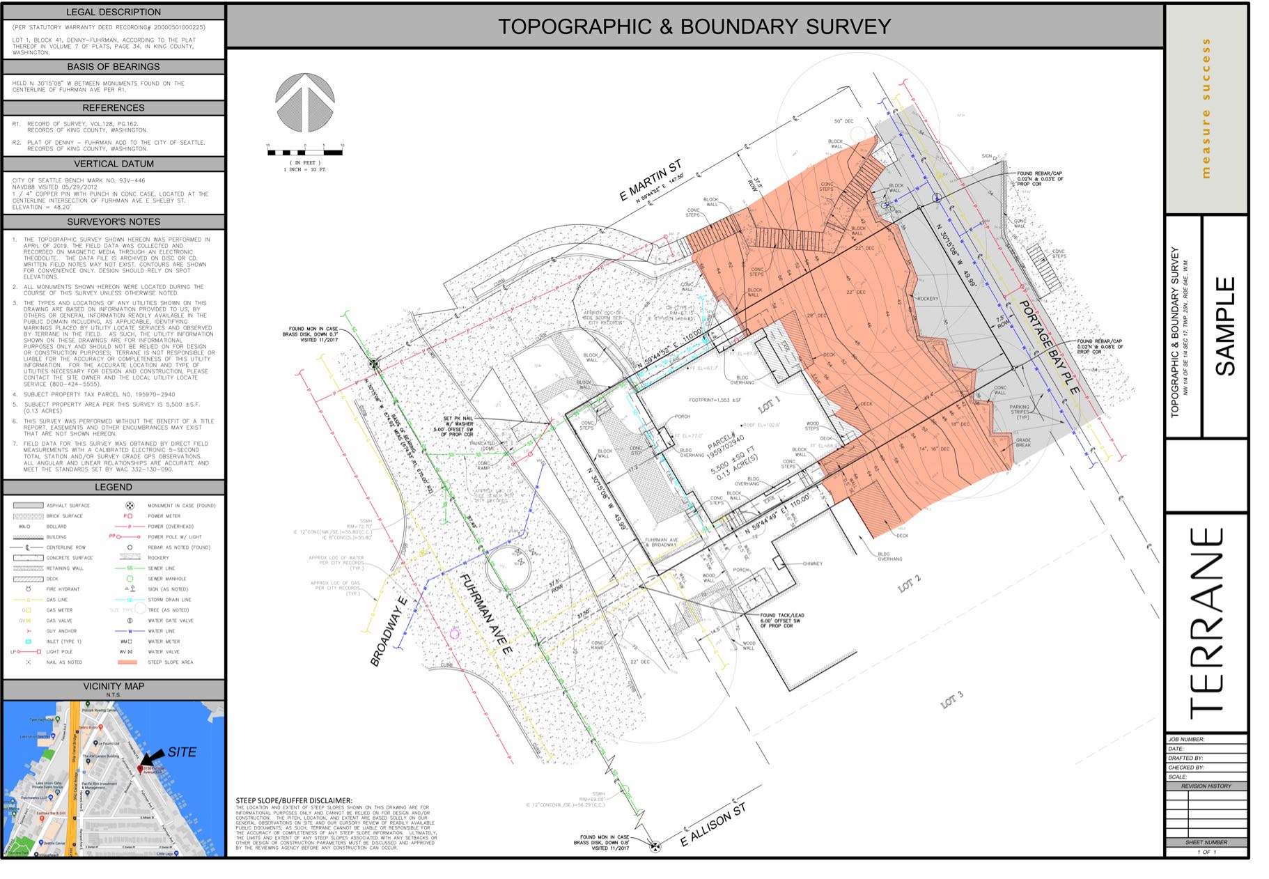 The definition of steep slopes can be dependent on municipal code and can vary from city to city. The City of Seattle defines a steep slope as “an incline of 40% or more with 10 feet of vertical rise over 25 feet or less.” Most jurisdictions that require ECA surveys can expand limits of a topographic survey by an additional 25 feet around the perimeter of the property, enlarging the survey mapping area. We are thorough and detailed on the drafting requirements for identifying 40% steep slopes and delineating the specific ECA steep slope areas on the final survey.