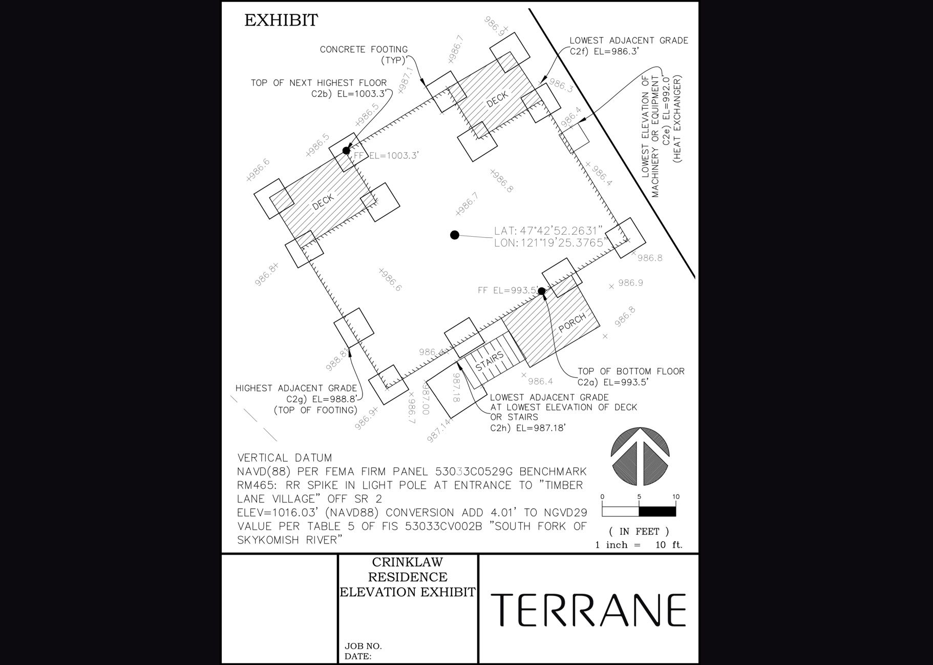 Terrane will prepare and certify your elevation certificate as required by the Federal Emergency Management Agency (FEMA). Only a licensed land surveyor or engineer can provide the certificate, which includes elevation data that FEMA can use to accurately assess flood risks to structures within flood hazard zones.