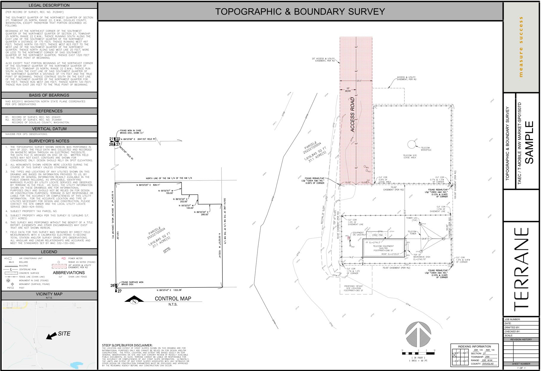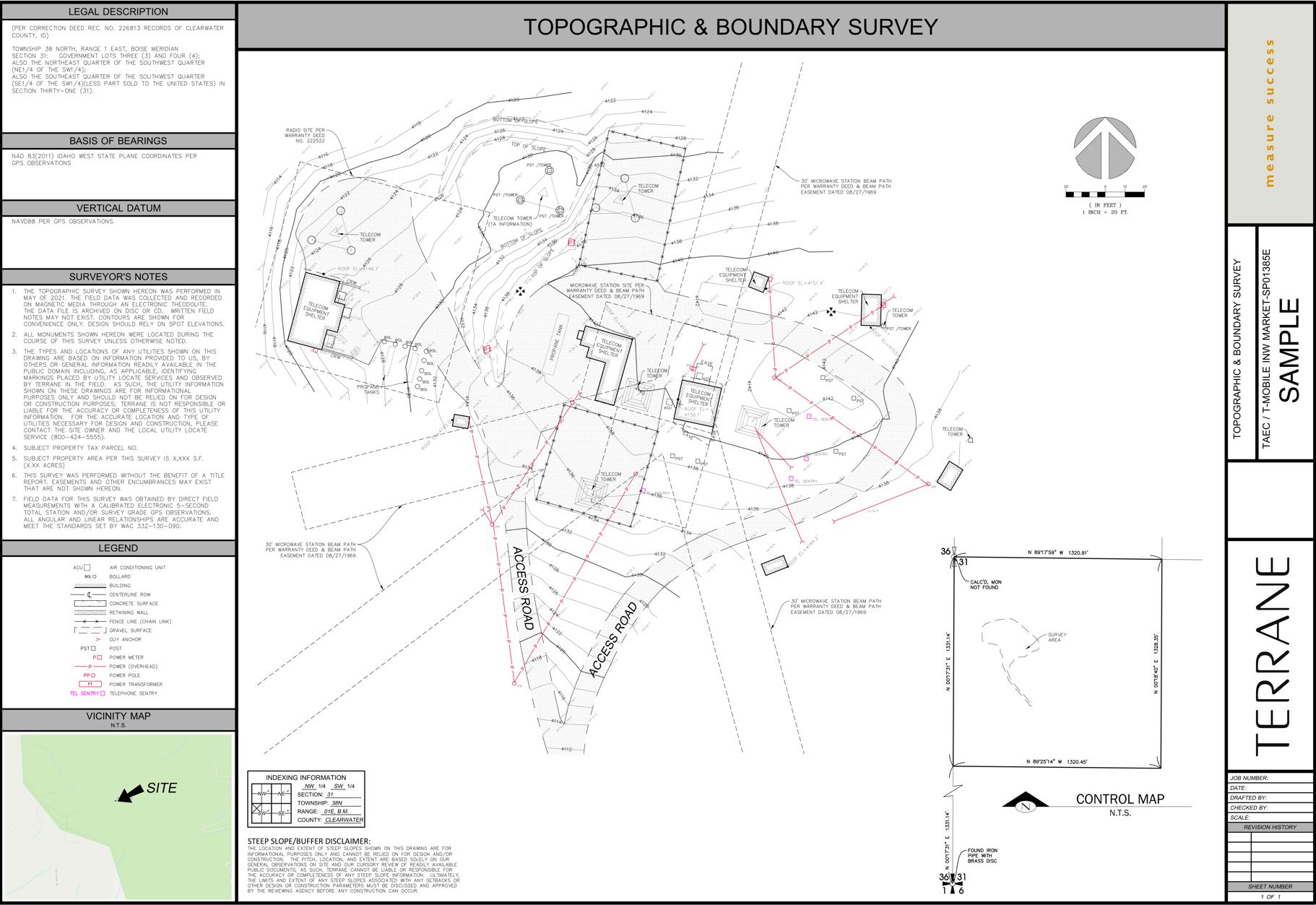 A boundary survey for a telecommunications site requires research into historical records to locate the boundary of the parent parcel for a potential wireless site. Plotting easements and items disclosed by a title report can aid in avoiding conflicts for the proposed site location. This can include topographic information for the entire parcel, or a specific location as required by the carrier or jurisdiction.