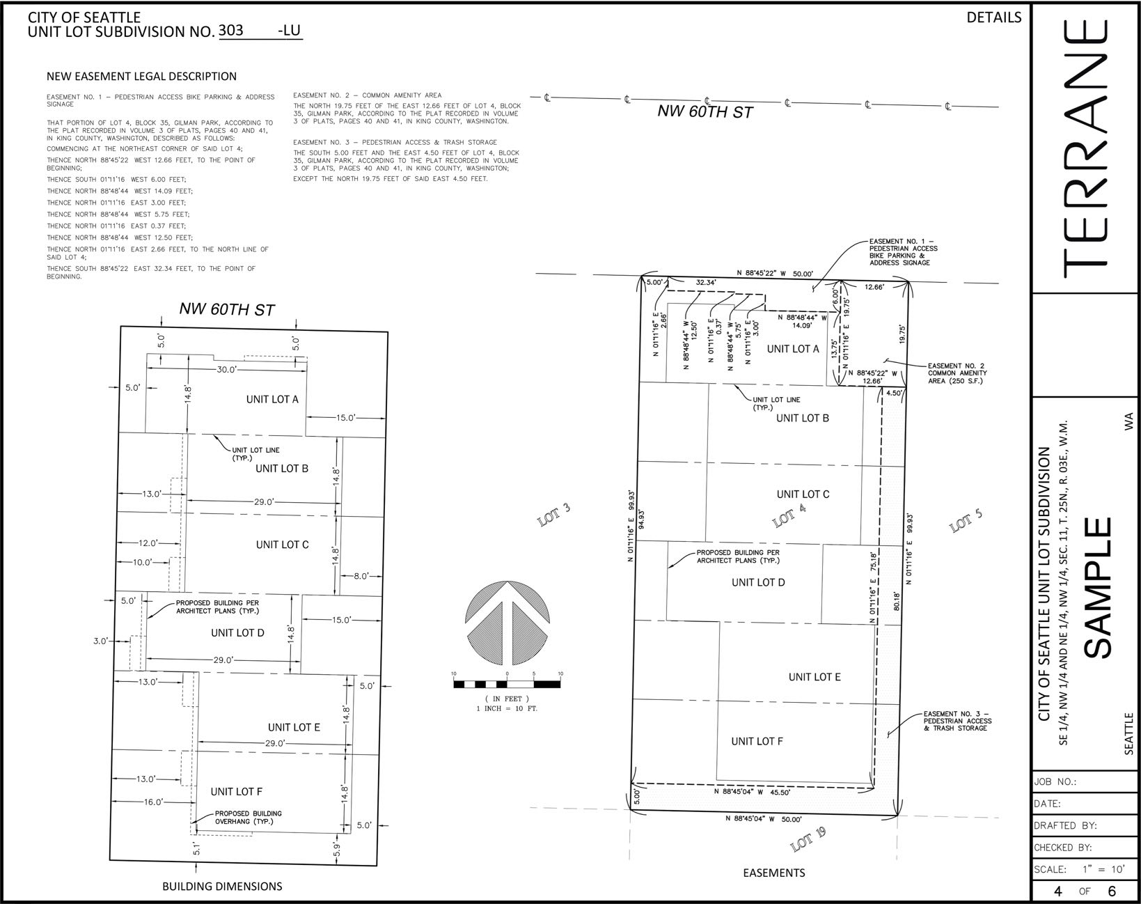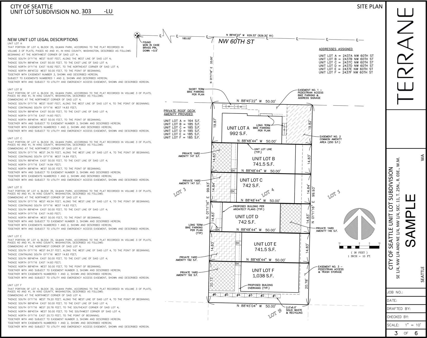 A unit lot subdivision defines boundary lines and uses areas within a larger “parent” lot to establish individual sellable lots. This type of survey is primarily used when multiple buildings are permitted to fit on a single original lot (e.g., townhouses or row houses). The individual unit lots created reflects the structure placement, amenity areas, and access and utility easement locations per the approved building permit(s). They are not separately developable lots, but they are capable of being sold individually.